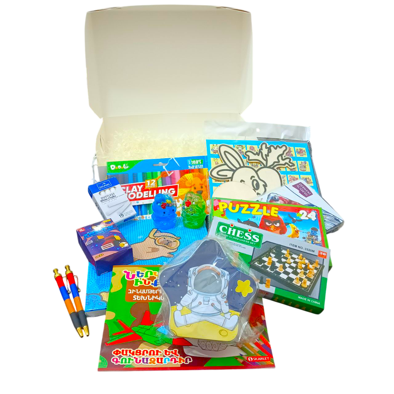 Գունեղ և զվարճալի գրենական պիտույքների և խաղերի հավաքածու Սկարլետի կողմից՝ նախատեսված աղջիկների և տղաների համար։ Սրա մեջ կգտնեք գրիչներ, մատիտներ, ֆլոմաստերներ, լիզուններ, փազլներ և տարբեր խաղեր՝ երեխաների երևակայությունը զարգացնելու և ժամանցն ուրախ անցկացնելու համար։Բոքսը պարունակում է՝