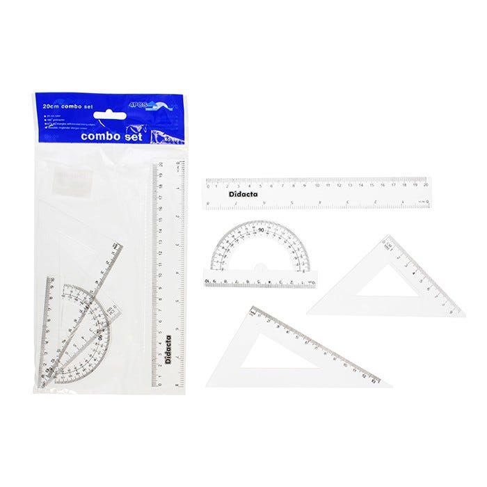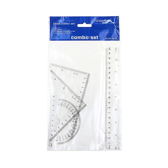 Комплектация: большой треугольник, линейка 30см, малый треугольник, транспортир.